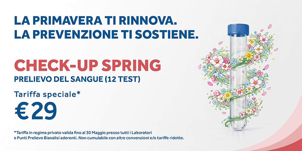 Fino al 30 Maggio, puoi eseguire il Check-up di analisi cliniche Spring a tariffa speciale* di € 29 nei Laboratori e Punti Prelievo Bianalisi aderenti.